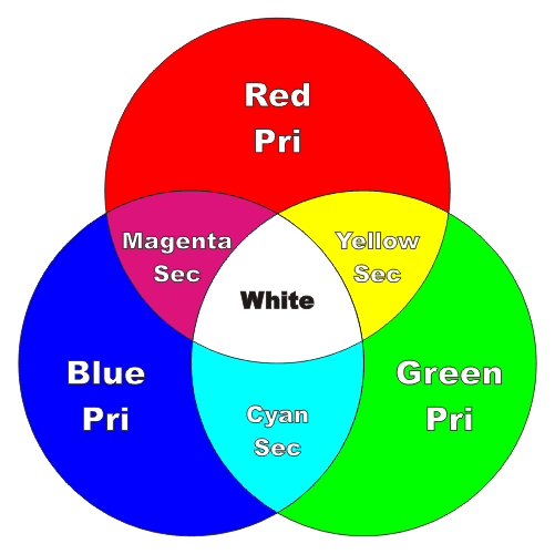 The primary colours of light are slightly different from those of pigments (paint). The primary colours of light are _____, _____ and _____. When two primary colours are mixed in equal amounts they form the secondary colours. The secondary colours of light are _____, _____ and _____. If all the primary colours are mixed together in equal amounts _____ is formed. By varying the proportions of the three primary colours, any shade can be made. This is how your television screens and even your eye works.