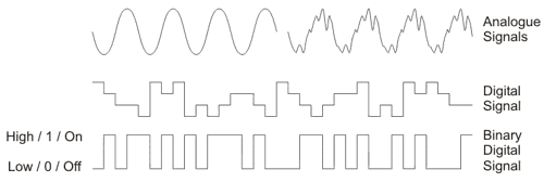 The world is analogue. A measurement could be any value. We can turn these measurements into signals, for example a microphone turns vibrations (from sound) into an electrical signal. We can then send this analogue signal to a speaker and reproduce the sound. But analogue signals are susceptible to noise. For data transmission / communications it is better to use digital signals. Digital signals can only be one of a set of values while binary digital signals can only be on or off (high or low).