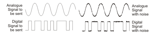 When noise is added to analogue signals it actually affects the data being transmitted, and produces distortion of the data. Digital signals still have noise added to them, but we are able to extract the signal being sent.